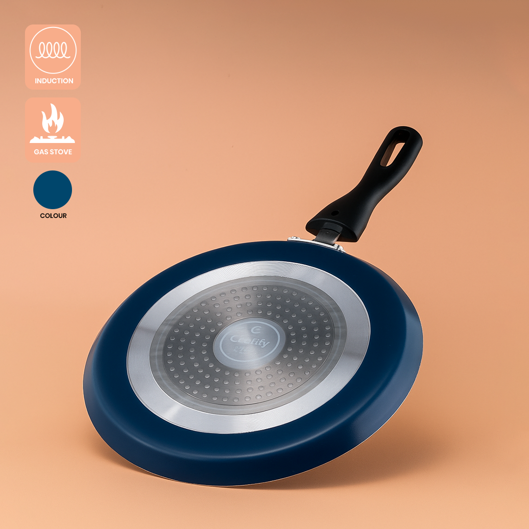 Cookify - Duron Non-Stick Flat Tawa 260mm features a durable 3-layer coating with a captivating granite finish, crafted using advanced German technology. Its chrome-finished, heat-resistant handle offers an elegant design and sturdy grip. PFOA-free and scratch-resistant, this tawa ensures superior heat conductivity for even cooking. Dishwasher safe and easy to clean, it is ideal for preparing dosa, roti, and more. Backed by a 1-year warranty, it combines functionality with lasting performance for expert cooking results.