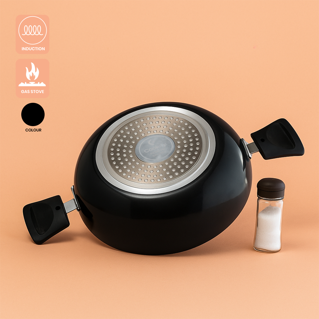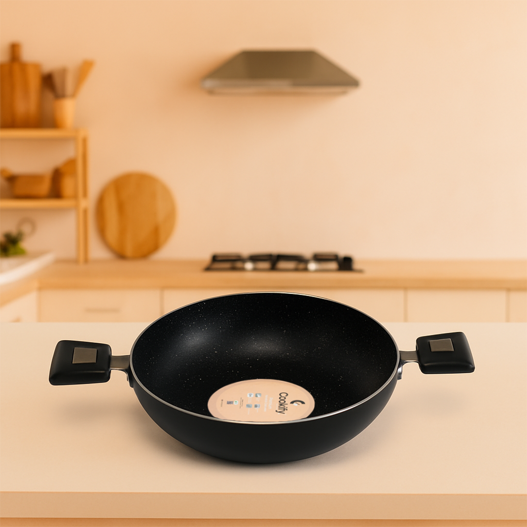 The Cookify Eva Kadai, 240 mm in Black, features a premium non-stick coating that ensures food releases easily and cleaning is hassle-free. Its sturdy design provides even heat distribution for consistent cooking results, making it ideal for sautéing, frying, and simmering. Combining durability with a sleek finish, this kadai is a versatile addition to any kitchen, delivering professional-quality performance with every use.