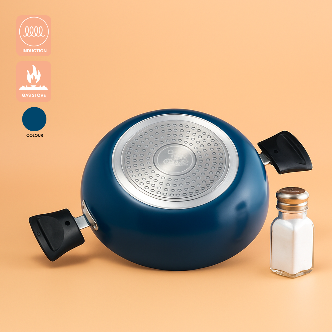 The Cookify Eva Kadai, 240 mm in Peacock Green, features a premium non-stick coating that ensures food releases easily and cleaning is hassle-free. Its sturdy design provides even heat distribution for consistent cooking results, making it ideal for sautéing, frying, and simmering. Combining durability with a sleek finish, this kadai is a versatile addition to any kitchen, delivering professional-quality performance with every use.