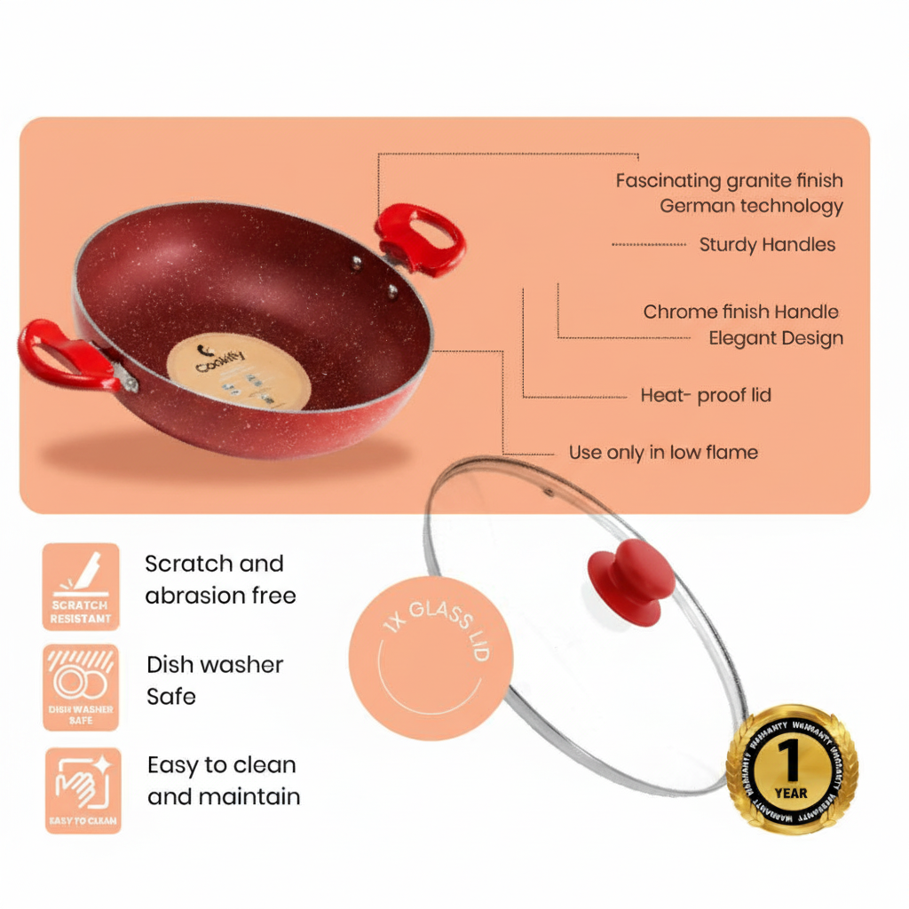 The Cookify Premium 4-Piece Non-Stick Cookware Set includes a 24cm Kadai with lid, a 24cm Frypan, and a 28cm Tawa, each crafted with a high-quality non-stick coating for superior performance. Designed for even heat distribution, this set ensures fast and efficient cooking with minimal oil. Built with durable materials and ergonomic handles, it offers both safety and comfort in everyday use. The sleek matte black finish enhances your kitchen’s look with a touch of elegance and modern style.This versatile set combines premium functionality with professional-grade quality, making it a must-have for every modern kitchen.